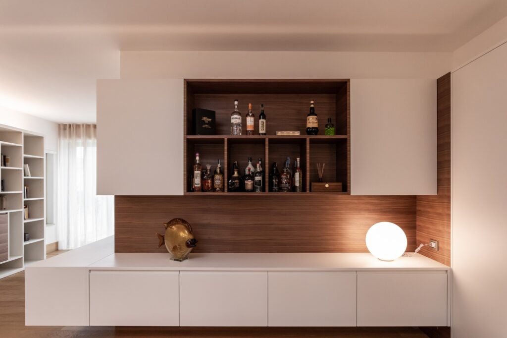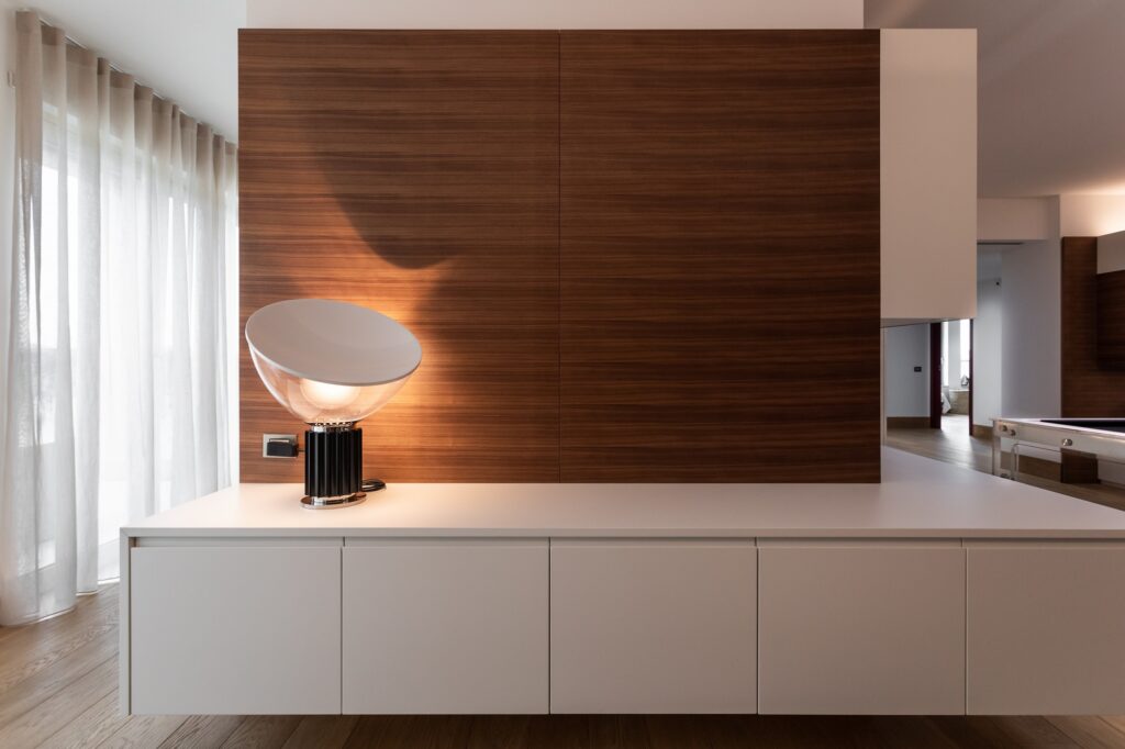 Il progetto si rivela nella precisione sartoriale dei particolari: arredi disegnati ad hoc, equilibri cromatici tra legni caldi e superfici chiare, l’inserimento calibrato di oggetti iconici di design. Ogni ambiente diventa manifesto di un’eleganza sobria, raffinata e senza tempo.