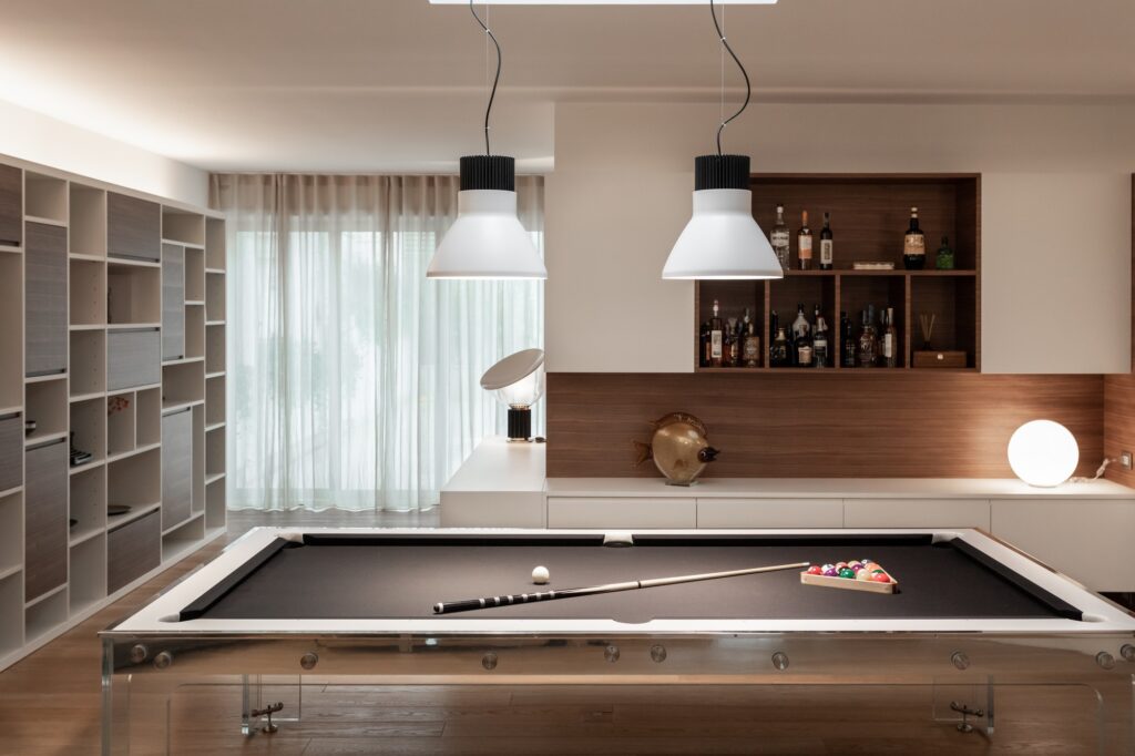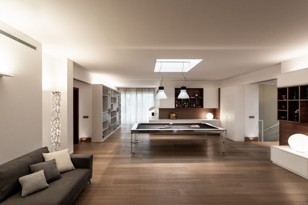 Gli interni sono concepiti come fondali della vita domestica: librerie su misura, boiserie in legno, pareti luminose che modulano l’atmosfera. La luce naturale penetra attraverso le ampie aperture, mentre quella artificiale plasma le stanze in scenari mutevoli, pensati per ogni momento della giornata.